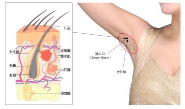 纳米可视靶向定位清除术结合国际最先进可视设备“Directional-3D700型外科手术导航系统”可在(0-1300倍)视野下对人体腋下组织进行定向探测、准确定位、精细分离大汗腺(臭汗腺)与正常组织,消融的大汗腺彻底吸出。既能避免其他腋臭手术以切、挖、掏等形式去除大汗腺时对腋下周围正常组织的伤害,又能实现许多患者无痛、无疤、不复发彻底根治腋臭。
